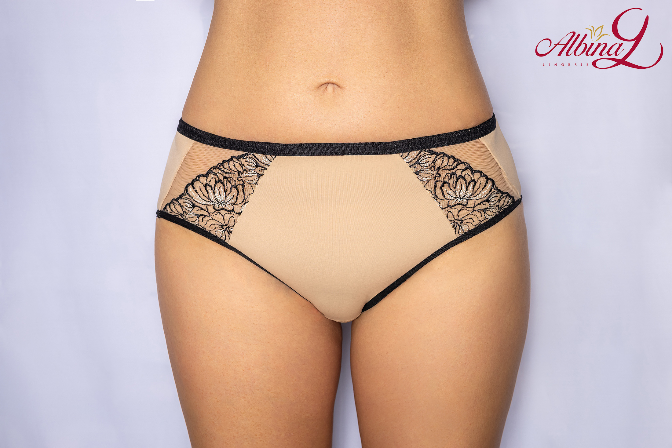 Трусы-слип 213 со средней линией талии. Выполнены из микрофибры и н эластичной вышивки. Срезы по краю ножек обработаны на плоскошовной машине.
